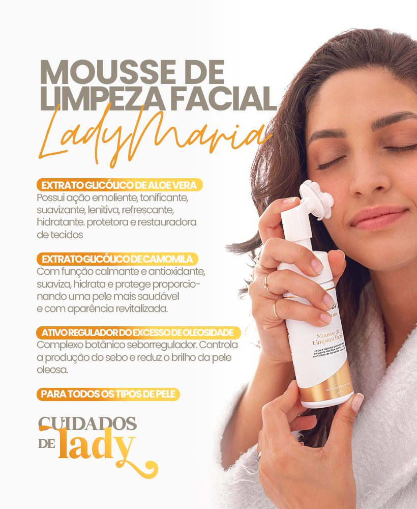 Desenvolvido com foco na limpeza profunda e higienização da pele, o Mousse de Limpeza Facial Lady Maria é especialmente formulado para proporcionar uma experiência eficaz. Sua embalagem inclui uma escova com cerdas projetadas para auxiliar na limpeza, tornando-a mais completa, enquanto mantém a suavidade e evita danos à pele. Além disso, sua fórmula hidratante possui propriedades calmantes, refrescantes e suavizantes, que promovem uma limpeza desejada para uma pele limpa e saudável.